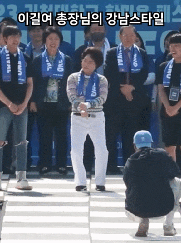 | ↑↑ 학교 축제에서 ‘강남스타일’ 말춤을 추고 있는 이길여 총장(사진 = 가천대 SNS 갈무리) |
