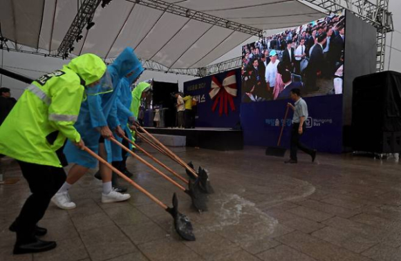 | ↑↑ 2025년 9월17일 오전 서울 여의도 선착장에서 열린 한강버스 취항식 행사장에서 관계자들이 넉가래로 빗물을 밀어내고 있다.(사진 = OM뉴스) |