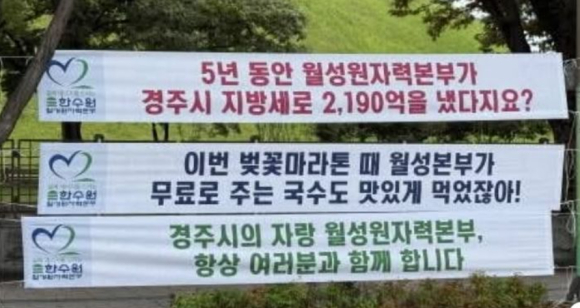 | 한수원 월성본부는 최근 '5년 동안 월성원자력본부가 경주시 지방세로 2190억을 냈다지요?', '이번 벚꽃마라톤 때 월성본부가 무료로 주는 국수도 맛있게 먹었잖아!' 등의 문구가 적힌 현수막을 내걸었다.