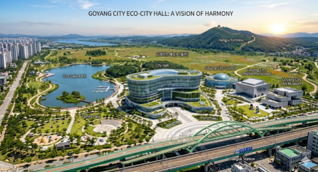 | ↑↑ AI가 생성해 준 대곡역 일원의 100년 대계 고양시 신청사 조감도, 멀리 행주산성이 보인다. (사진 = OM뉴스 자료) |