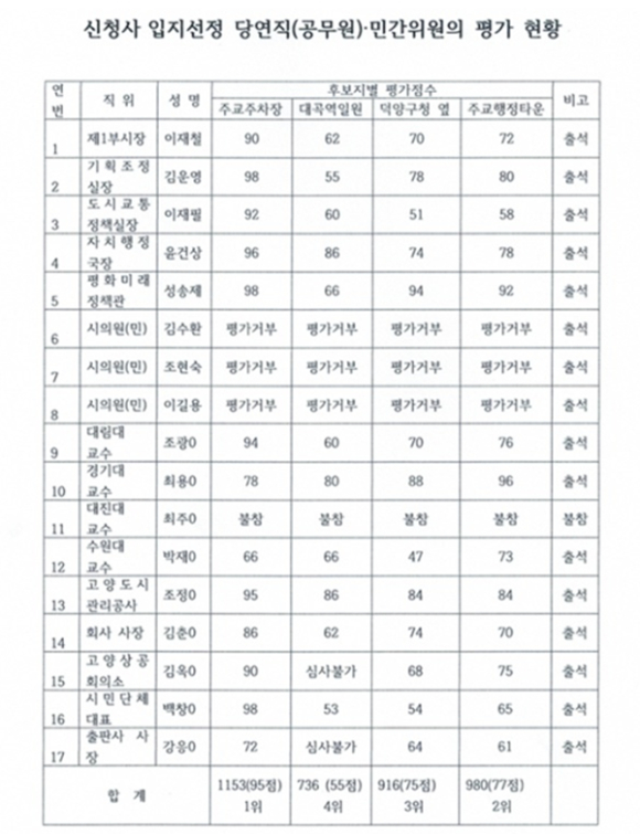문제는 선정회의에 민주당 시의원 3명이 불참한 가운데 13명이 평가에 참석했는데 평가지에 2명의 ”대곡역세권이 최적의 입지임에도 불구하고 건립이 불가하다하니 평가할 수 없음“이라고 기재하고 평가를 하지 않았고, 또 대부분 위원들은 시가 원안으로 추진하고 있는 원당주차장부지 일원에는 후한 점수를 주고, 대곡역세권에는 최하 점수를 주거나, 0점을 주는 자도 있었다.