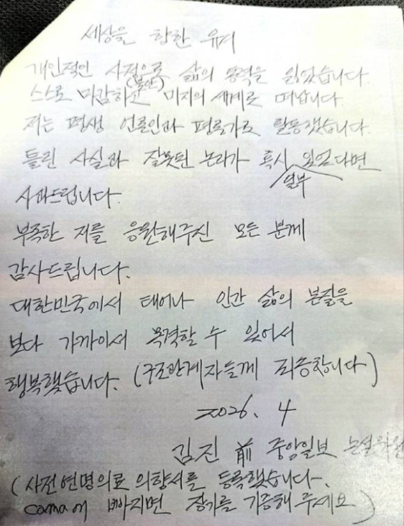또한 "대한민국에서 태어나 인간 삶의 본질을 보다 가까이서 목격할 수 있어 행복했다"는 소회를 남기며 삶을 정리하는 심경을 밝혔다.