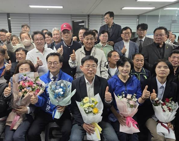 이날 현장에는 경선 과정에서 경쟁하고, 최종 경선에서 명재성을 팽하고, 민 후보 지지를 선언했던 이경혜, 이영아, 장제환, 최승원 전 예비후보들도 함께해 승리의 기쁨을 나눴다. 이들은 민 후보의 당선이 확정되자 한마음으로 축하를 건네며 민 후보의 손을 맞잡고 번쩍 들어 올렸다. 앞서 민 후보 지지를 선언하며 힘을 실어줬던 이들이 결선 투표 마지막 순간까지 자리를 지키며 '원팀 민주당'의 강력한 결속력을 증명해 보인 셈이다.