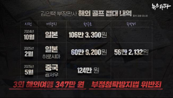 | 김 부장판사가 청탁금지법 위반 혐의를 받고 있는 해외 골프 여행은 모두 세 차례다. 검찰 공소장에 따르면, 김 부장판사는 HDC신라면세점 황 모 팀장으로부터 2024년 10월부터 2025년 5월, 일본 히로시마와 중국 광저우 등을 오가며 비행기값과 숙박비 총 347만원을 제공받은 혐의를 받고 있다.